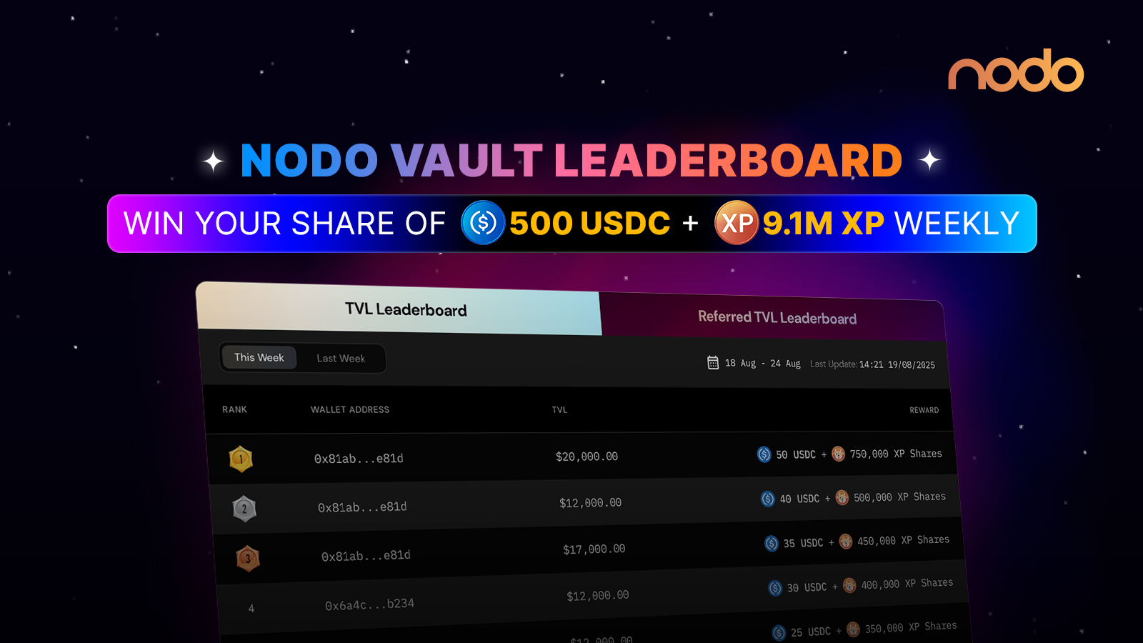 # NODO Vault Leaderboard: Win Your Share of 500 USDC + 9.1M XP Weekly